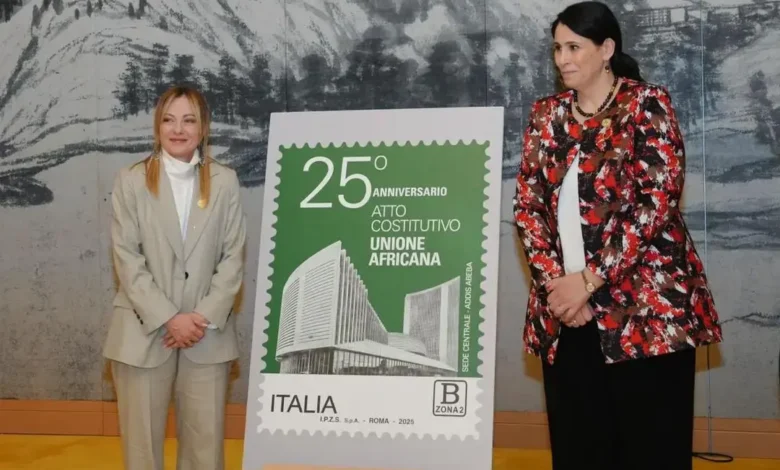Today, Sunday, in Addis Ababa, on the sidelines of the 39th African Union Summit, the Vice-Chairman of the African Union Commission, Salma Malika Haddadi, and the Prime Minister of the Republic of Italy, Giorgia Meloni, unveiled a postage stamp commemorating the 25th anniversary of the founding of the Union.