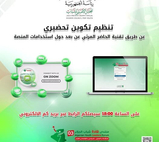 Today, the Supreme Youth Council is organizing a preparatory training via the remote visual presentation technology at 20:00 pm, dedicated to explaining the uses of the event management platform. digital And mechanisms for benefiting from its various services, within the framework of completing the implementation of the program established within the Algerian Youth Leaders Forum 03.