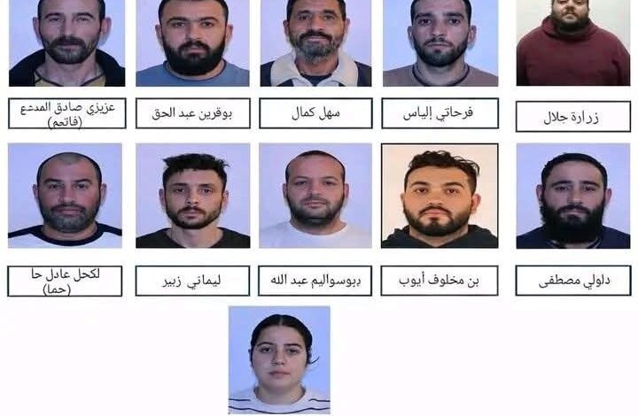 Following the preliminary investigation carried out by the National Gendarmerie Search and Investigation Department in Sharqa, 11 people were arrested and caught in flagrante delicto. The matter concerns: the so-called Buswalim Abdullah, 45 years old, Buqrin Abdul Haq, alias Osama, 39 years old, Farhati Lias, 29 years old, Azizi Sadiq, 39 years old, Mady Jamila, 31 years old, Sahl Kamal, 56 years old, Ben Makhlouf Ayoub, 22 years old, Limani Zuber, 37 years old, Daluli Mustafa, 34 years old, Lakhal Adel, known as Al-Hami, aged 41 years, and Zararda Jalal, nicknamed Al-Washi, aged 31 years, were in possession of a significant amount of psychotropic substances.”